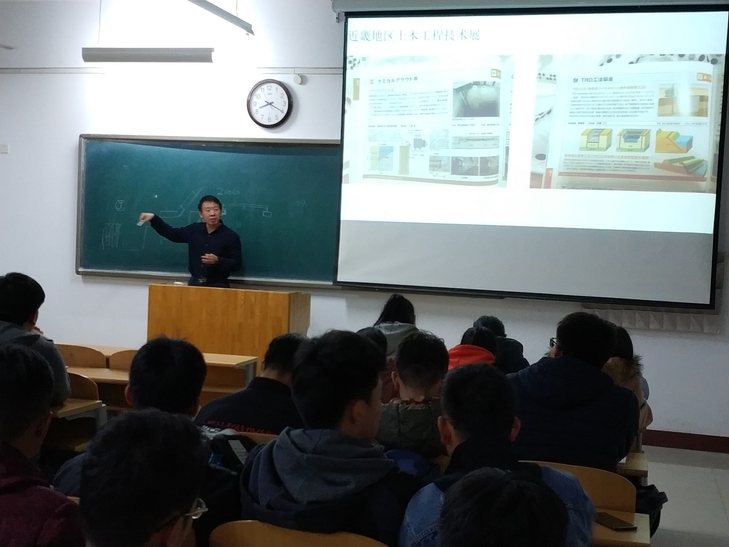 尚文涛结合自己在日本京都大学一年的生活学习经历以及科研收获,将报告内容分为4个方面:日本趣事、日本京都大学趣事、课程学习及听报告、科研进展,详细介绍了岛国日本的地理风光、人文精神、民居环境以及高等教育发展情况,对日本京都大学的发展历程、科研水平、师资力量、学术氛围以及土木与建筑工程学院的专业设置等进行了重点解读,使在座师生增进了对该校的认识和了解,为相关专业学生继续深造提供了借鉴和参考。随后,尚文涛博士分享了自己旁听4门研究生课程和聆听近百场学术报告的个人体会与心得,生动讲述了平面应变统一强度方程的提出历程,并展示了其在挡墙土压力、地基临界荷载和隧道弹塑性分析中的应用途径和潜力。最后尚文涛向同学们介绍了国外的建筑本科教育模式,又深入浅出的给同学们分析了部分在日本的大师建筑,使在场学子获益匪浅。